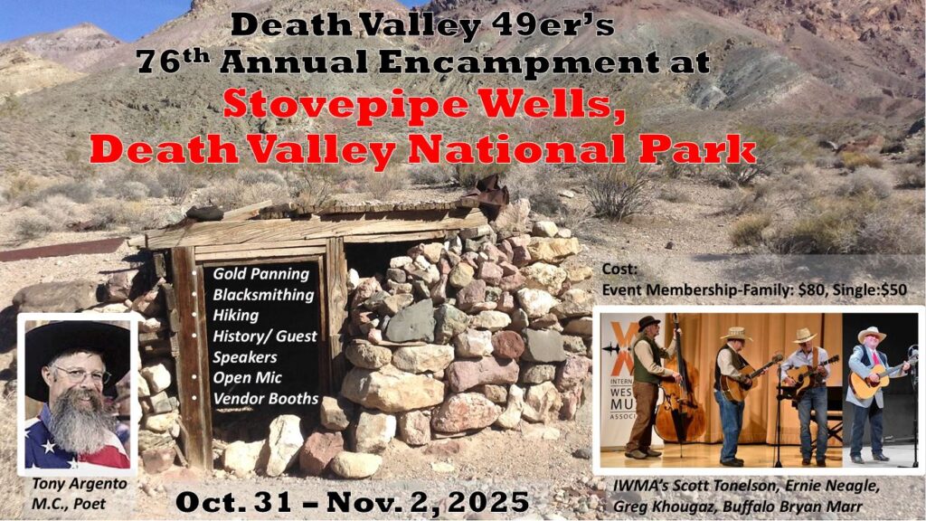 I will be at Stovepipe Junction between Oct. 31 and Nov. 2nd at the Death Valley 49er’s 76th annual Encampment. You might find me at the Gold Panning booth or maybe the Open Mic doing some poetry or music. Come on by and say hi. They will have music, guest speakers, activities, vendors and more. You can find more information on the encampment at: https://deathvalley49ers.org/